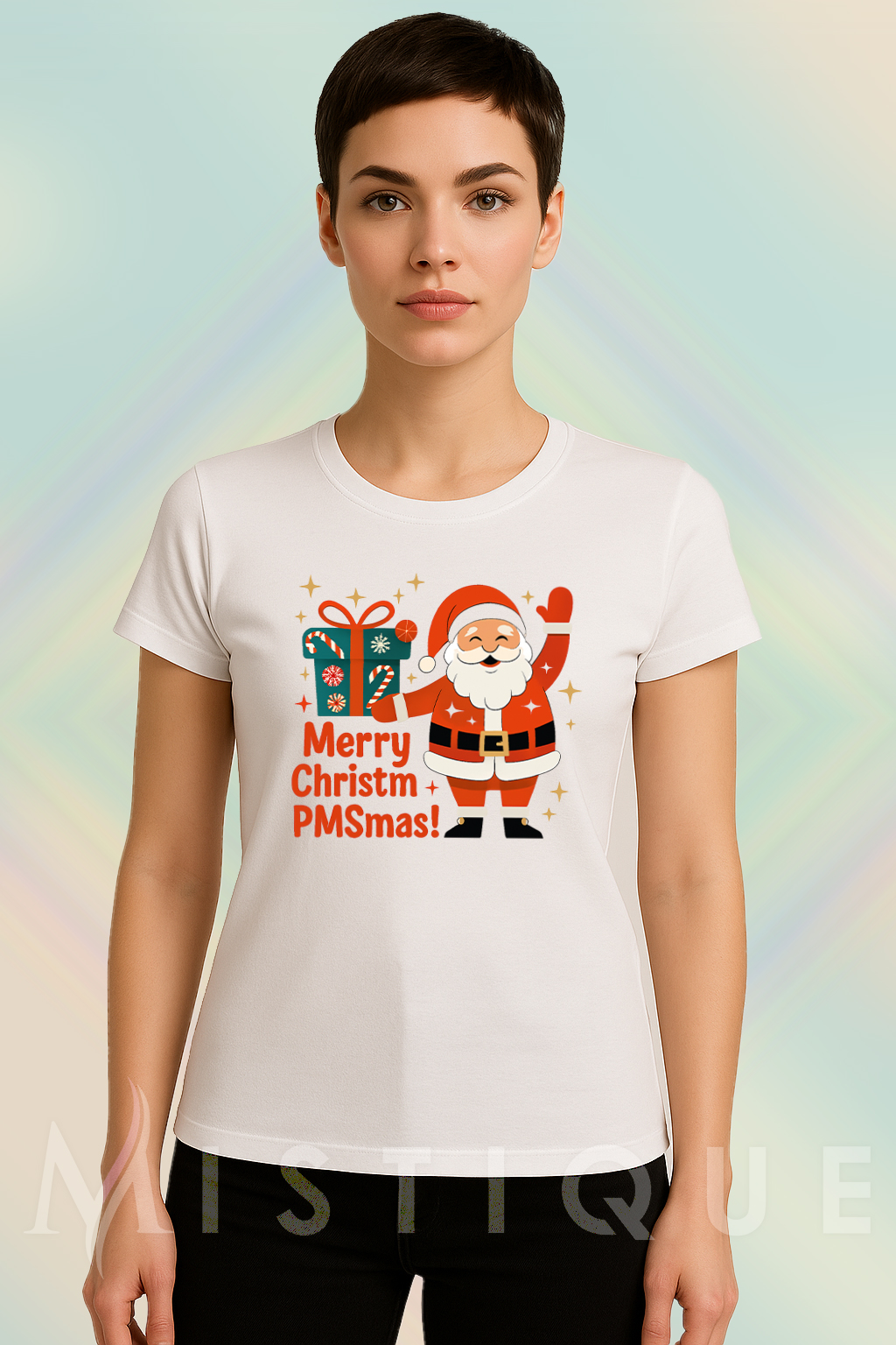 Na majici se nalazi veseli Djed Božićnjak koji nosi poklon i natpis “Merry ChristmPMSmas!”.