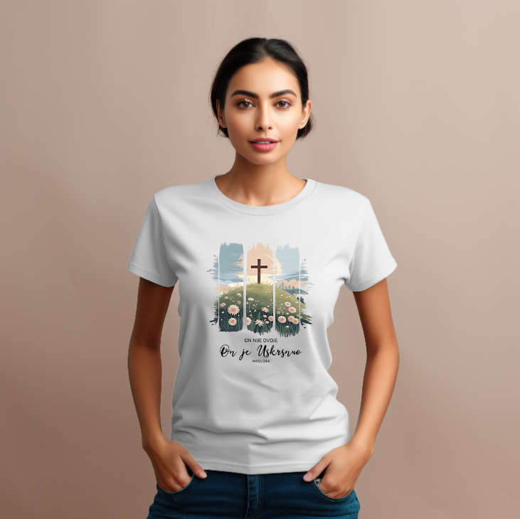Unesi snagu uskrsne poruke u svoj stil s majicom “On je Uskrsnuo”. Dizajn prikazuje križ obasjan zrakama izlazećeg sunca, okružen cvijećem i prirodom – sve podijeljeno u elegantne vertikalne poteze koji podsjećaju na slikarski dodir. Ispod ilustracije stoji snažna poruka iz Evanđelja po Mateju 28:6: