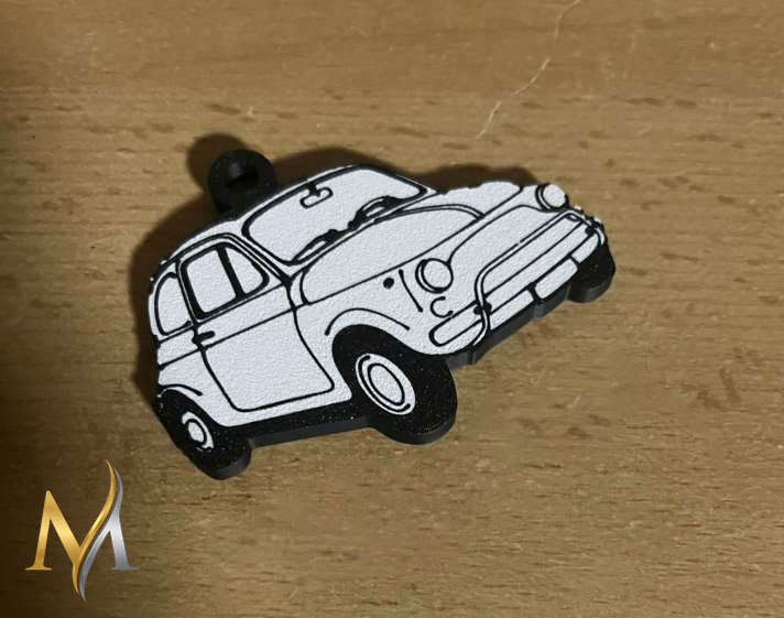 Privjesak Fiat 500 s čistim, retro ilustriranim dizajnom. Diskretan, lagan i idealan dodatak za ključeve svakog ljubitelja legendarnog Fiata 500. Gotov proizvod, bez personalizacije.