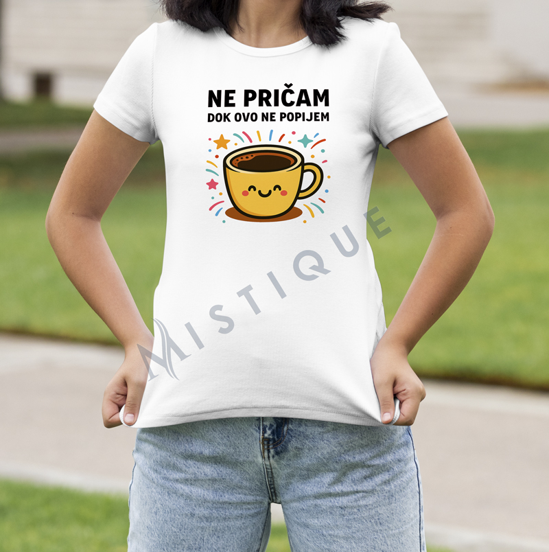bijela majica s dizajnom šalice kave i natpisom NE PRIČAM DOK OVO NE POPIJEM