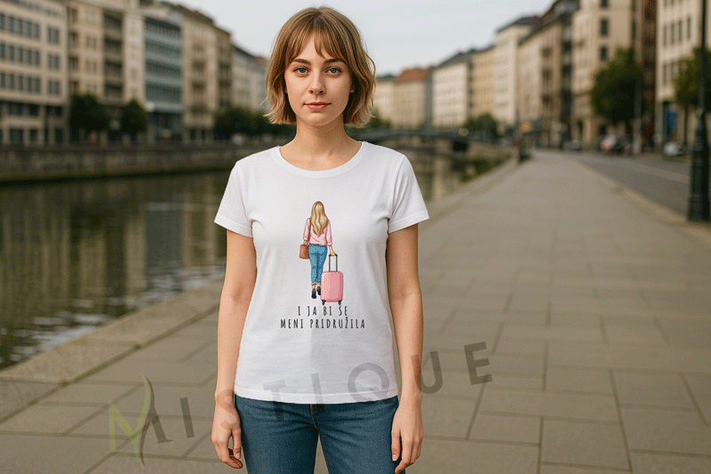 Bijela majica s ilustracijom žene s koferom i natpisom “I ja bih se meni pridružila”