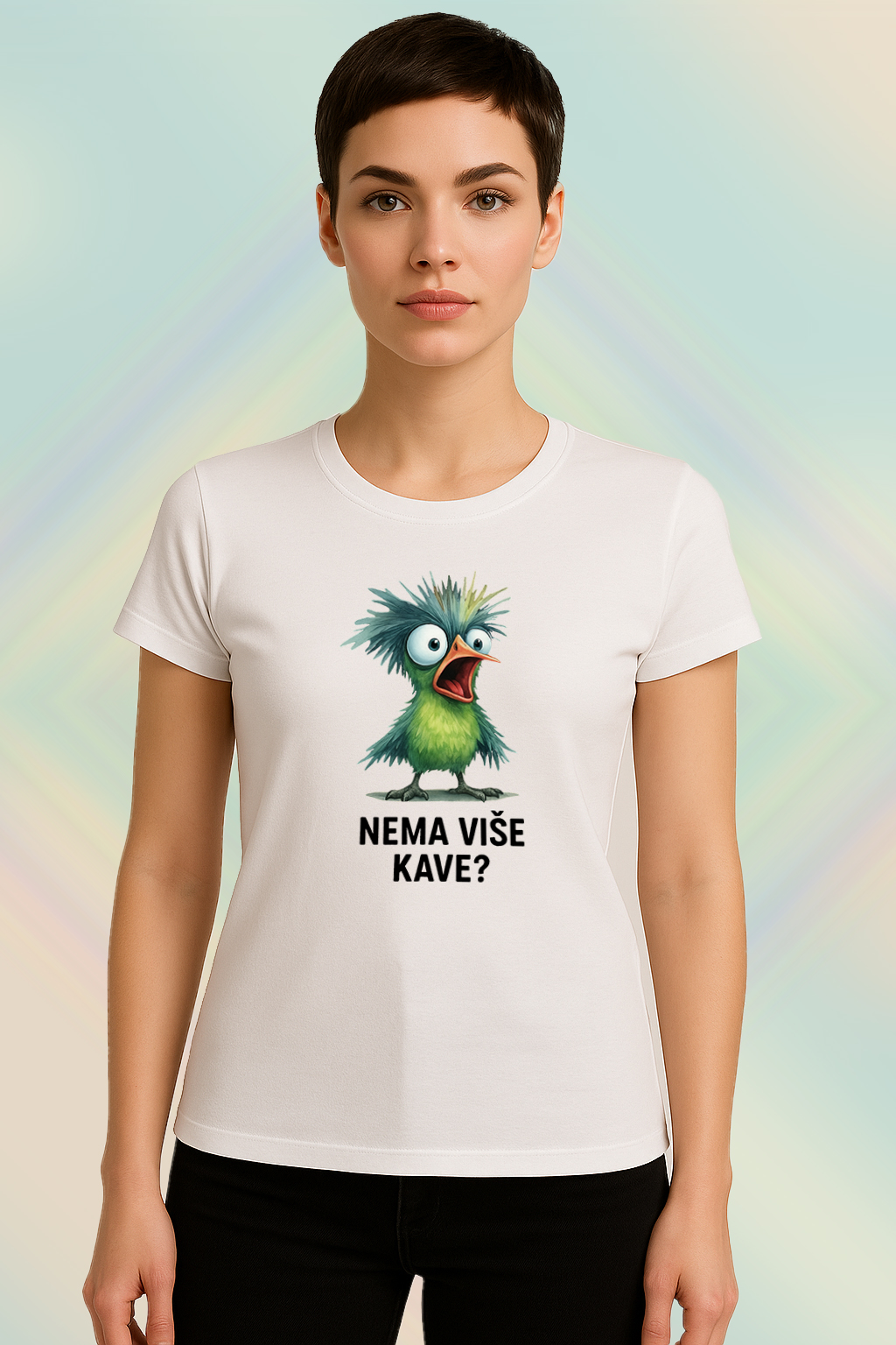 Bijela majica s ilustracijom zelene ptice i tekstom “Nema više kave?”.