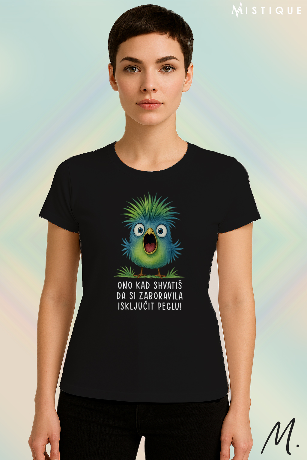 Bijela ili crna majica s ilustracijom zelene ptičice i tekstom “Ono kad shvatiš da si zaboravila isključit peglu!”.