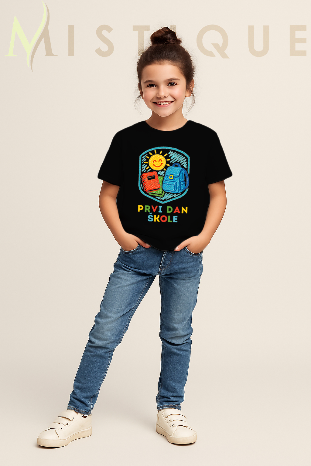 Dječja majica s natpisom “Prvi dan škole” u školskom motivu – dostupna u bijeloj i crnoj varijanti. #Mistique #MistiqueStyle