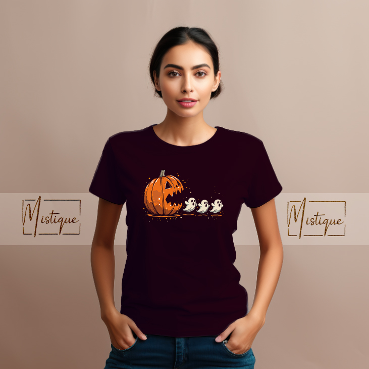 Elegantna majica s bundevom i duhovima u “Pac-Man” stilu – savršena mješavina klasike i šarma.