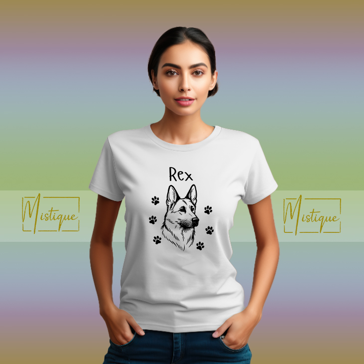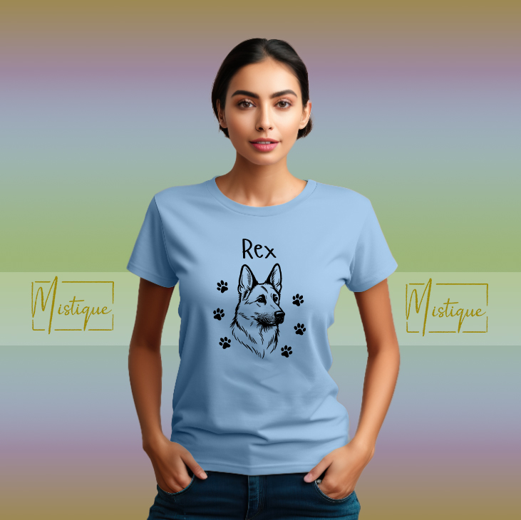 Personalizirana majica s ilustracijom njemačkog ovčara i imenom po želji. Dostupno u više boja, savršeno za sve koji žele nositi svog psa uvijek sa sobom.